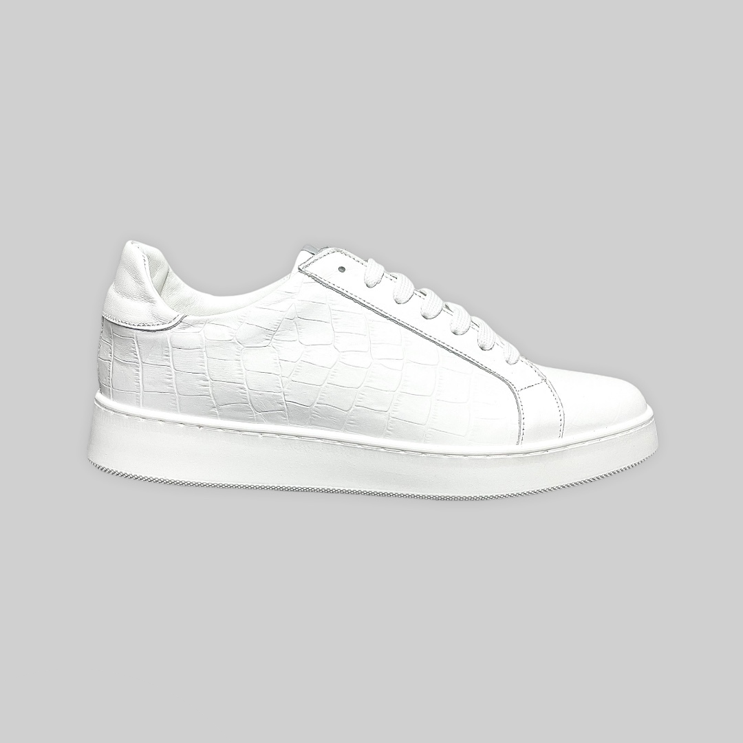 Sneakers versatile, laterali in pelle stampa coccodrillo, sono adatte per essere utilizzate in ogni situazione e sotto ogni tipo di pantalone.