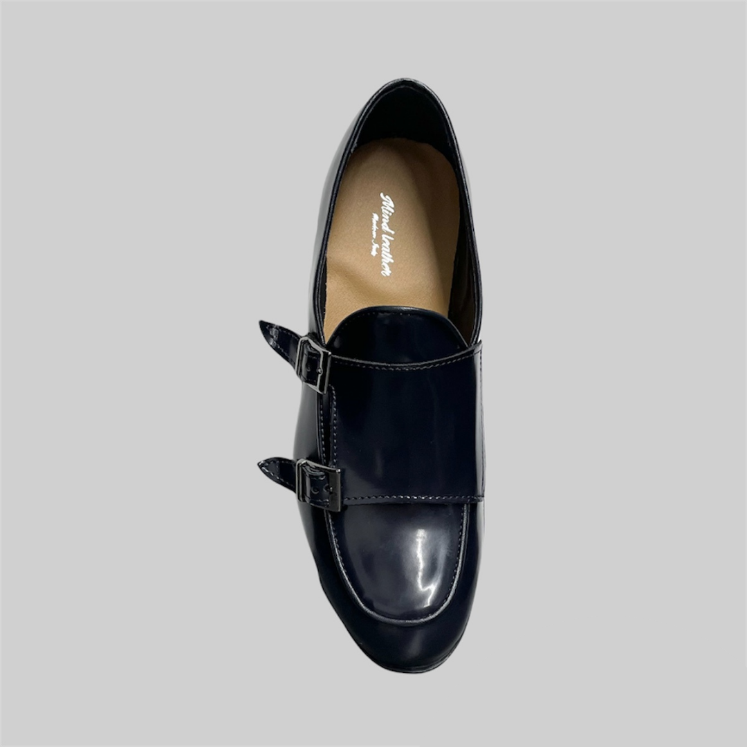 Doppia fibbia in pelle abrasivata lucida, adatta per situazioni formali, abbinabile ad abiti scuri o completi.