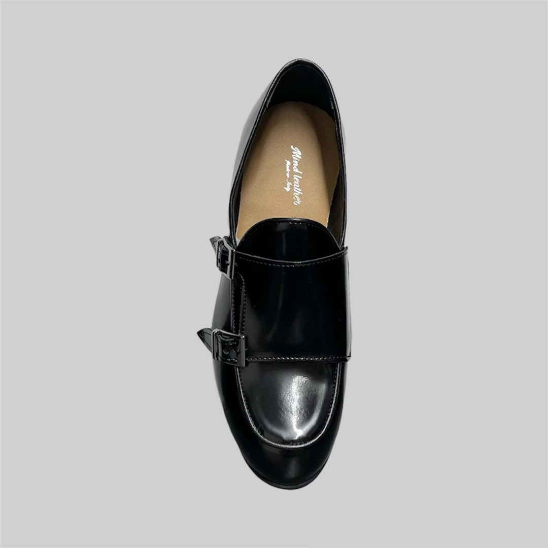 Doppia fibbia in pelle abrasivata lucida, adatta per situazioni formali, abbinabile ad abiti scuri o completi.