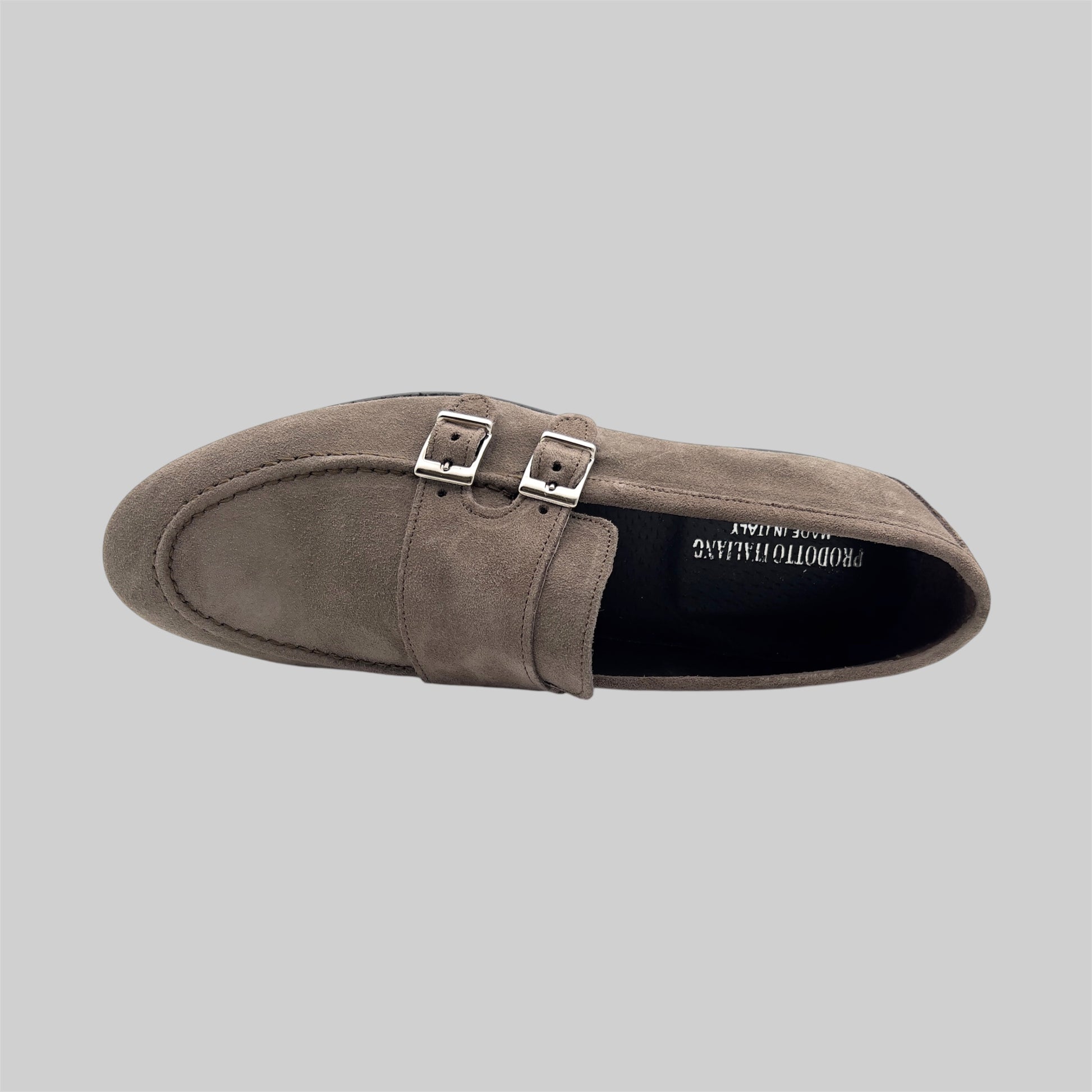 Doppia fibbia in pelle scamosciata, adatta per situazioni informali, abbinabile ad abiti chiari.