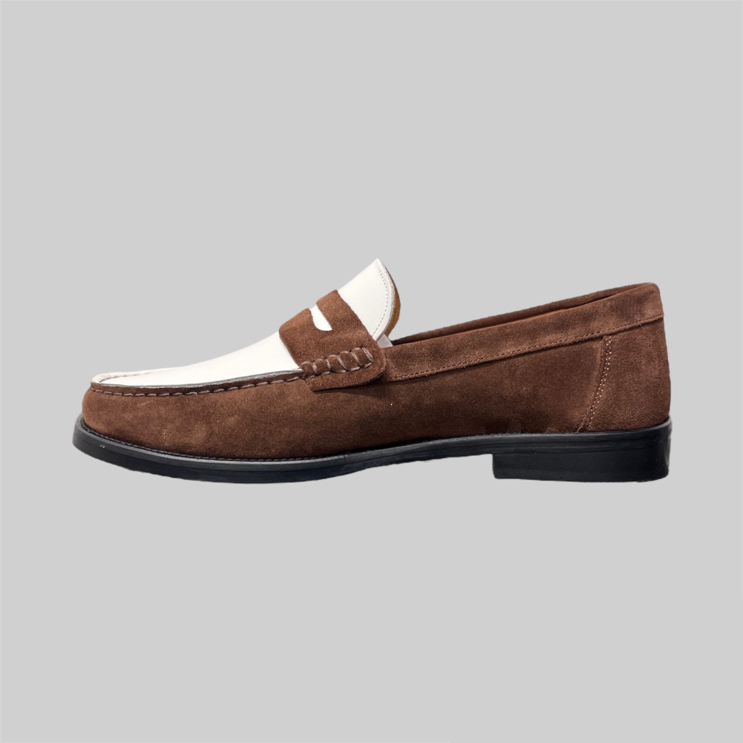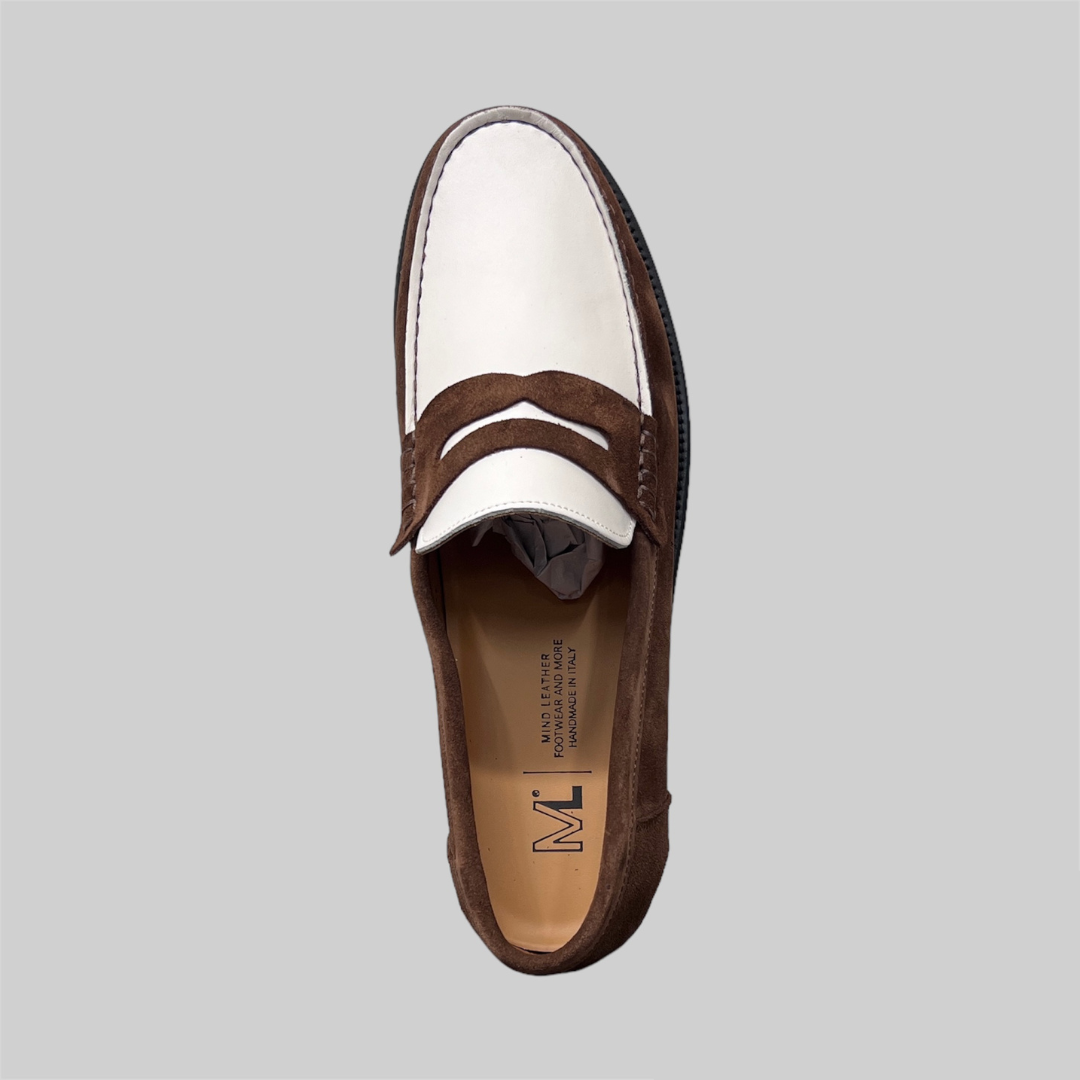 Il mocassino Penny è realizzato a mano con una tomaia in morbida pelle e camoscio cucita a mano, con una suola in cuoio cucita resistente e con gomma antiscivolo. Presenta un design tradizionale ed è realizzata con plantare estraibile e fodera in pelle per maggiore comfort e qualità.